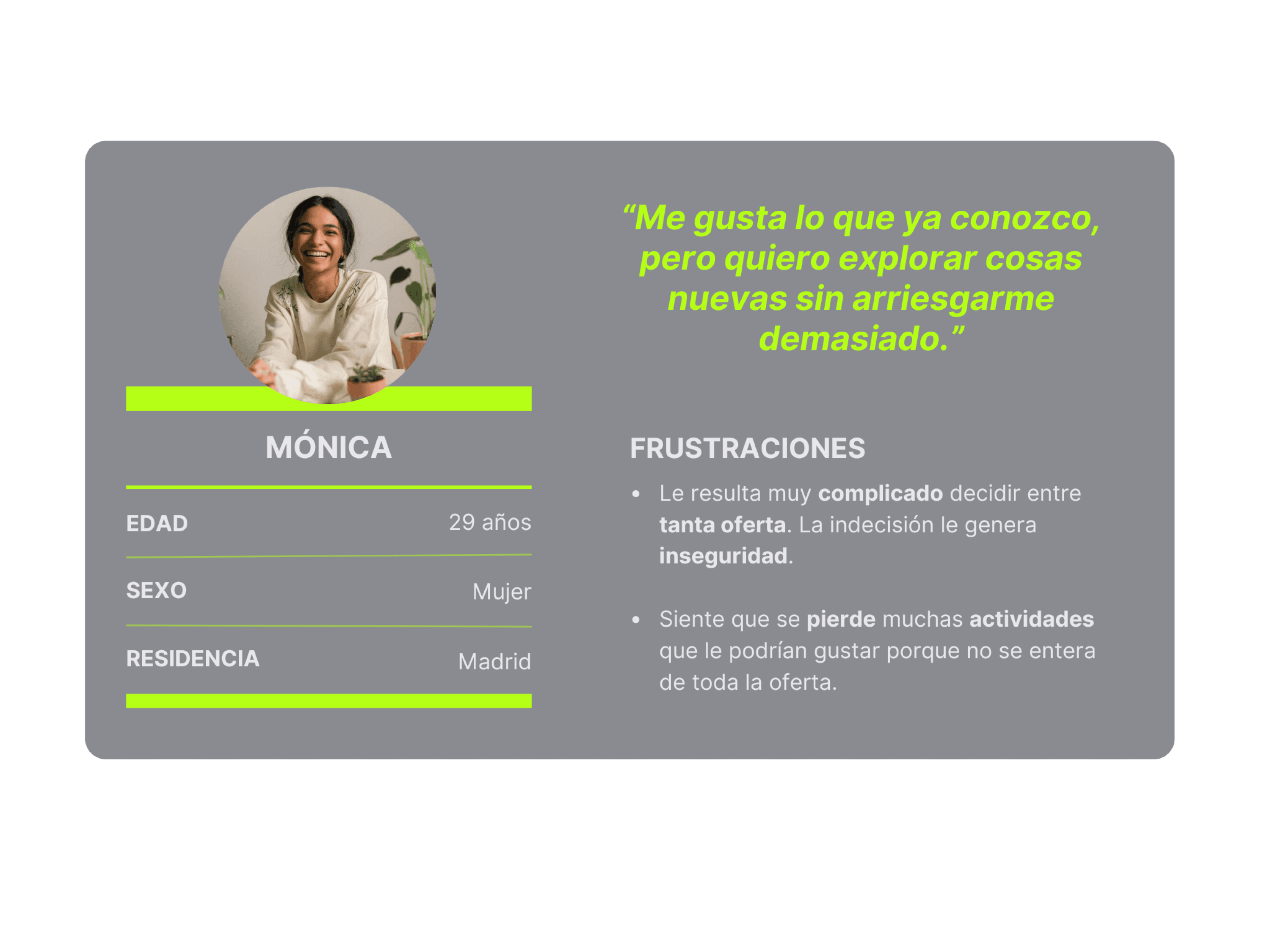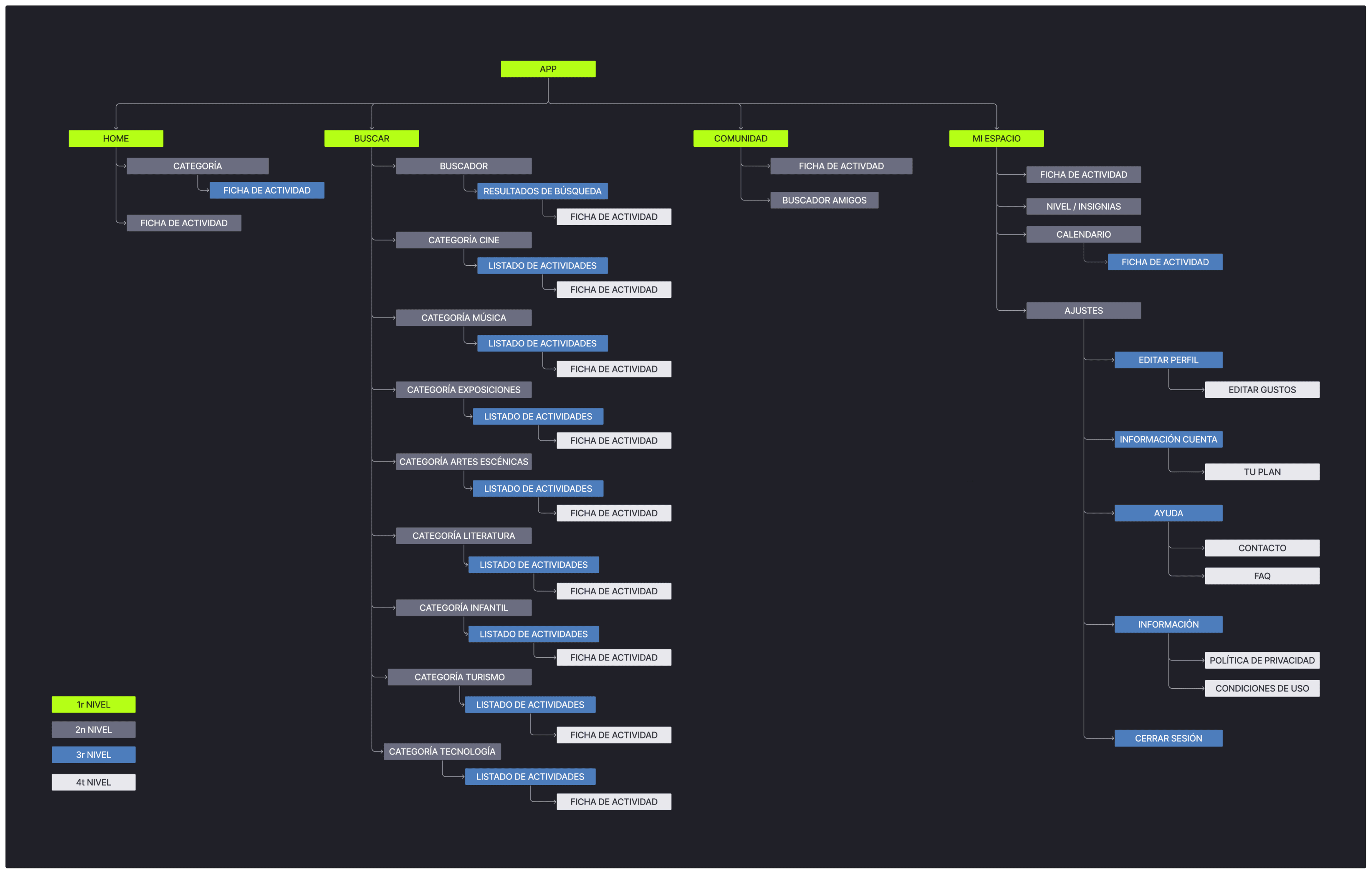After gathering this information and understanding our users through interviews, we realized our design challenge was to create a solution that addressed these obstacles and creates a space for young people with cultural interests to connect, share and enjoy their leisure. Making them feel as secure as possible with their choices was our motto.